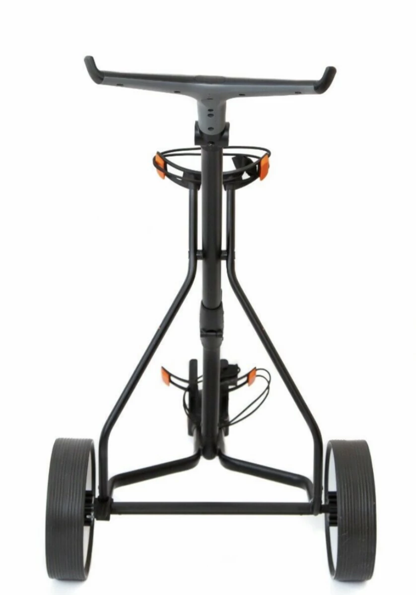 The Golfstream Vision Express Golf Push Trolley is set to take the golf market by storm based on the best selling Vision golf trolley frame the express offers lightweight performance . The highly functional express trolley folds flatter than most trolleys via a one touch super simple fold/unfold system. The ergonomic dual grip handle offers the ultimate in maneuverability and the vision trolley frame features a 2 sided accessory station which allows for an umbrella and drinks holder to be mounted simultaneously. The trolley is constructed from a lightweight powder coated aluminium frame that offers both durability and stability whilst on the course. Top and bottom bag cradles with bungee securing cods allow the express to accommodate any size of golf bag including larger tour bags. The front wheels feature housing to avoid clogging and this Golf trolley also has Super slick high grip PU rubber tyres that are durable and built to last.